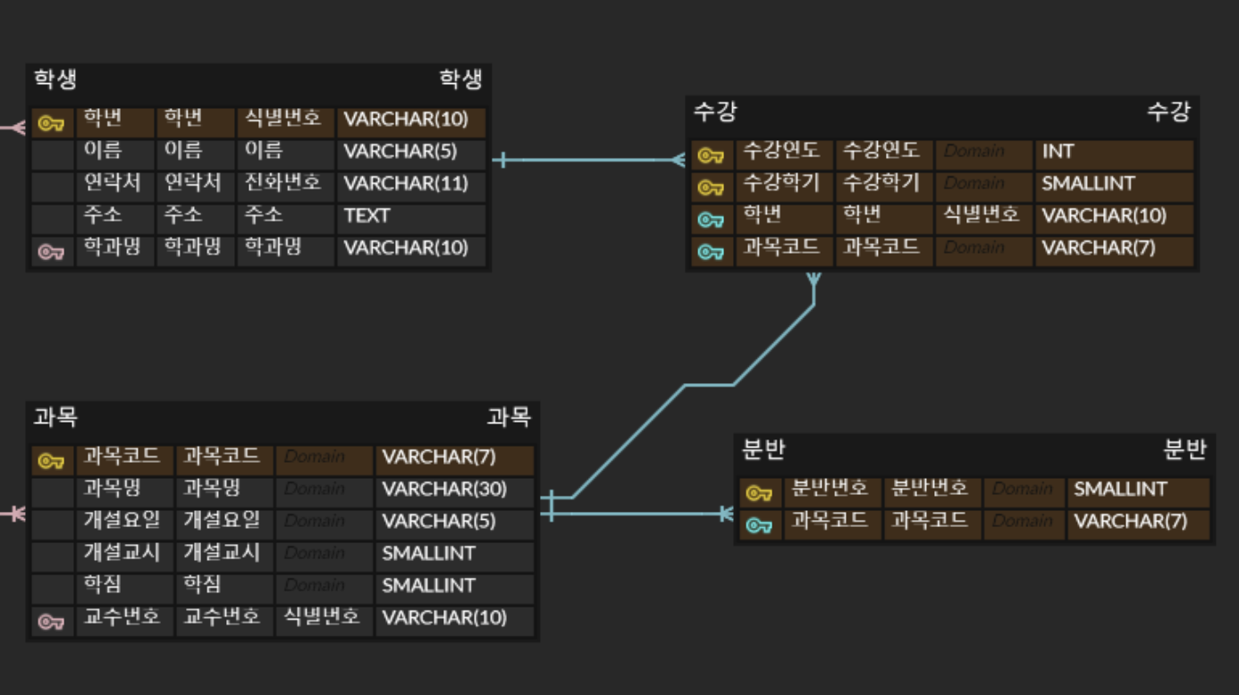 수강 엔티티의 경우 학생 엔티티와 과목 엔티티가 다 : 다 로 연결되기 때문에 1 : 다로 각각 연결을 끊어주기 위해 새로 만든 테이블이다.